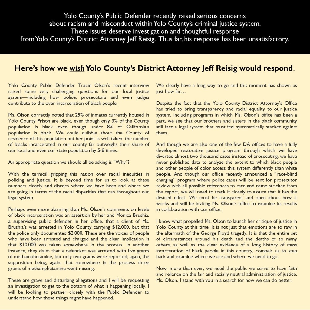 Below is a “response” that I wrote. It is the response I believe Yolo County District Attorney Jeff Reisig should have given to discussions about racial inequality in our county’s legal system. Many have stepped up spontaneously to support it. You will find their names here as well.