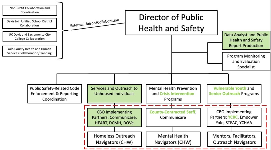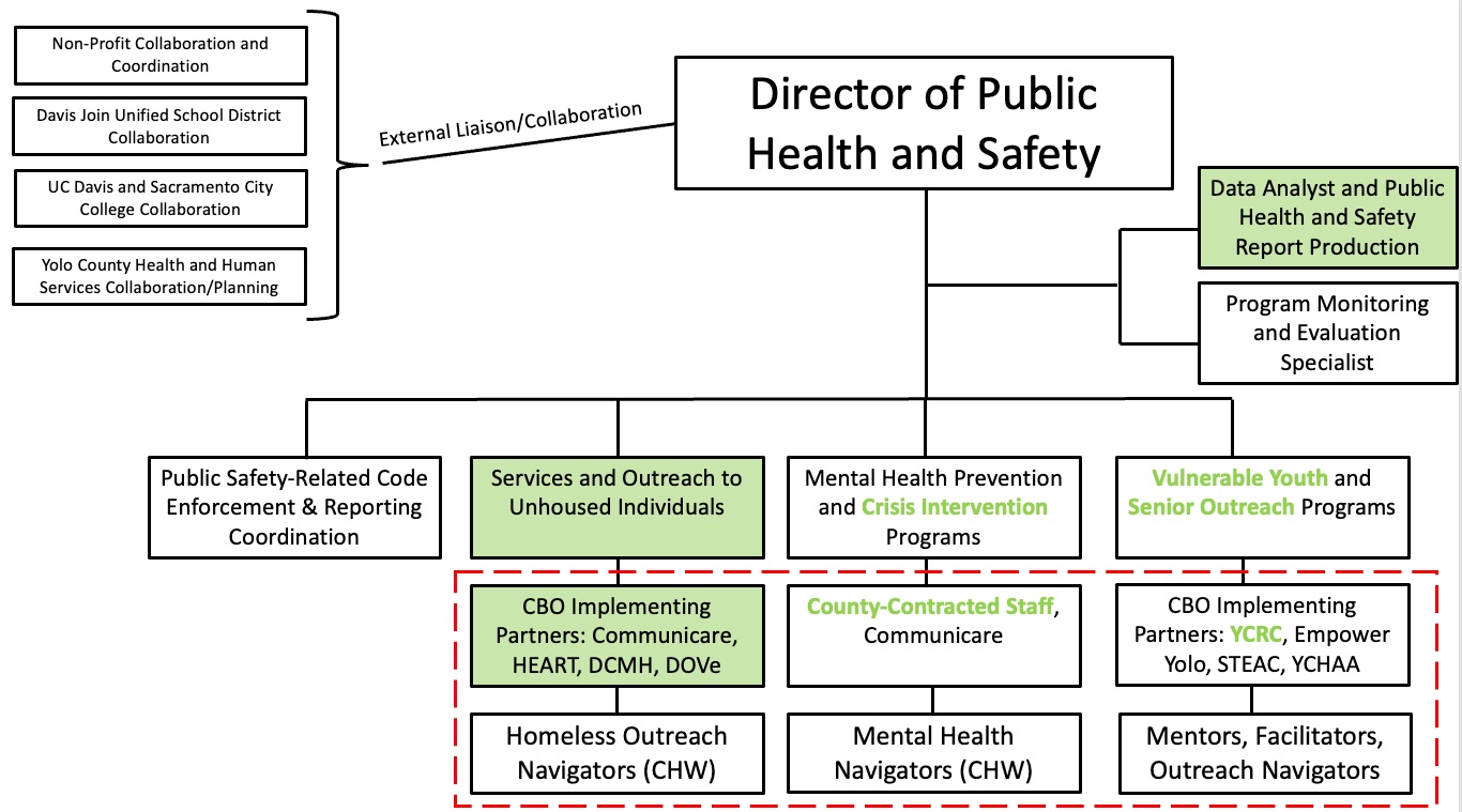 While police departments have taken on many public health-type functions in cities across the US, they are not designed to address public health challenges effectively. Davis already has various public health programs related to homelessness, youth diversion, and mental health crisis interventions. A public-health-trained Director of Public Health and Safety can lead a small department to focus on greater coordination of current efforts, help the City Council set clearer programmatic priorities, leverage County resources, and create synergies with UC Davis, DJUSD, and non-profit organizations in the City. To advance public health efforts, the City Council should create and fund a new director position that reports to the City Manager.