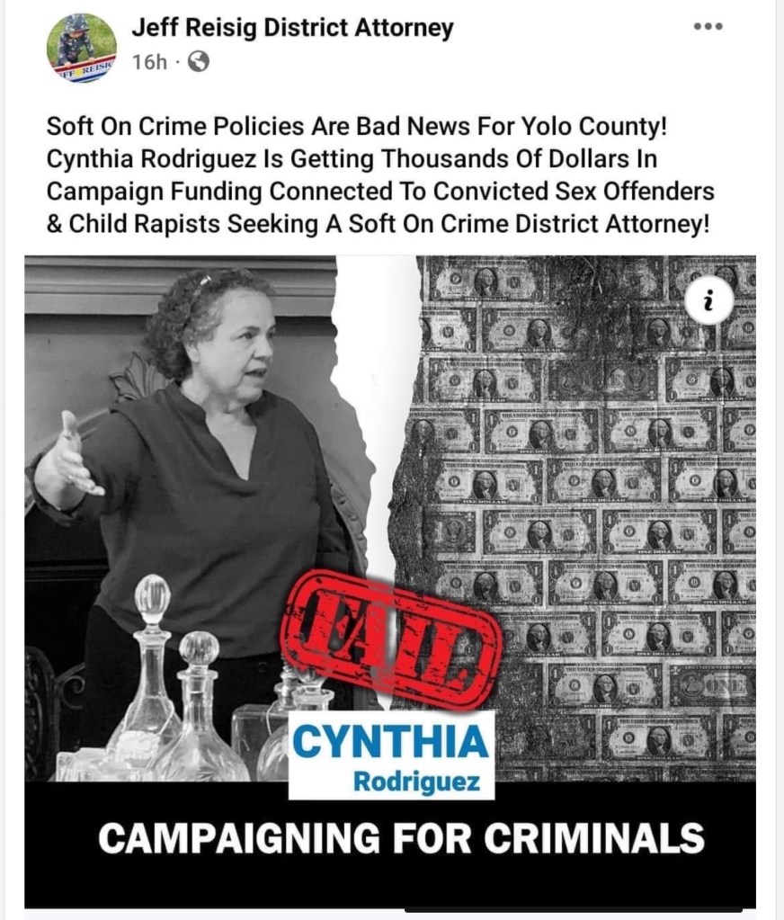 When District Attorney Jeff Reisig used a similar trope in a campaign advertisement (alert?) attacking Cynthia Rodriguez, he did the same thing. The trope is designed to place Ms. Rodriguez beyond the pale—not just someone who is likely to coddle criminals, but the worst kind of predators. She is a danger.