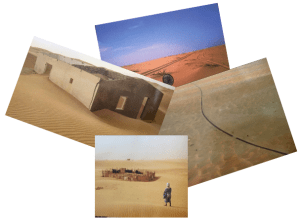About 100 km in, we came to the end of the paved road, and then it was a desert track through imposing dunes that were overtaking palm groves and any other living thing in their path.